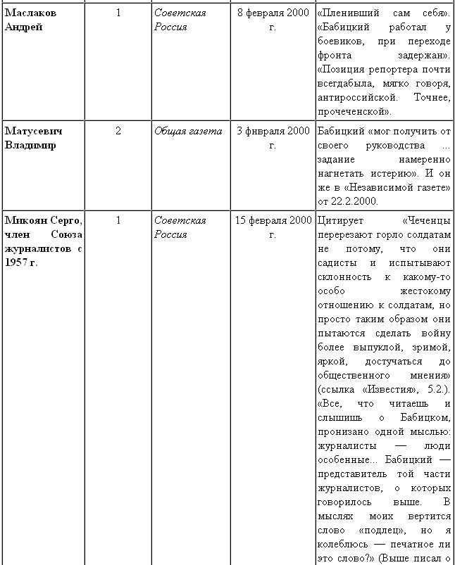 «Не надо путать свободу слова с целенаправленной враждебной пропагандой во время войны», – написавший это Н. Верхоянский не стал уточнять, как отличить свободу слова от пропаганды. Это попробовал сделать Ю.Богомолов, введя к тому же термин «психологическая война»: «То, что мы называем информационной войной, на самом деле таковой уже не является. Между Россией и мятежными формированиями в Чечне на информационном поле идет сугубо психологическая война… Снимки с выколотыми глазами российских солдат – вещь того же ряда. Создание или распространение их – это что угодно, но не журналистика». Более эмоционально то же у А. Проханова: «Бабицкий – гранатометчик «информационной войны», работавший рука об руку с чеченскими снайперами… наносивший по русским войскам удары, соизмеримые со взрывом вакуумных бомб».