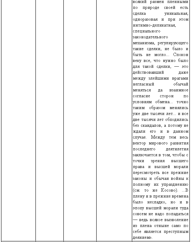 Более того, представители одной и той же позиции одобрительно отзывались о якобы милитаристски настроенном журналисте, который-де «погиб как солдат» (А. Курганов), – и критиковали Бабицкого именно за то, что тот якобы уподобился солдату (утверждение «погиб как солдат» о журналисте Яцине было мифом, ибо тот как раз поехал в Чечню как профессионал-журналист, фотографировать войну для западных СМИ, более того, оказавшись в плену, принял ислам, за что его сторонились товарищи по несчастью). Таким образом, оказывалось, что журналисту нормально быть солдатом, если он «воюет» на «нашей» стороне, и ненормально, если на противоположной. Если бы просто осуждалось предательство, это было бы логично, но тут речь не о предательстве (которого и не было), а о неспособности выработать универсальный этический критерий, признать во враге подобного себе.
