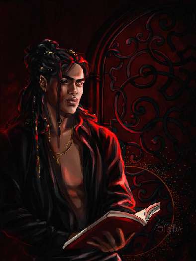 Сквозь туман я его разглядела, он развалился в кресле, которое, должно быть, притащил из собственных покоев. Небрежно закинул ногу на ногу, держа в длинных пальцах книгу, а огонь камина превращал его бронзовую кожу в теплое золото. Косы были распущены, каждая бусина и кольцо поблескивали в свете.
