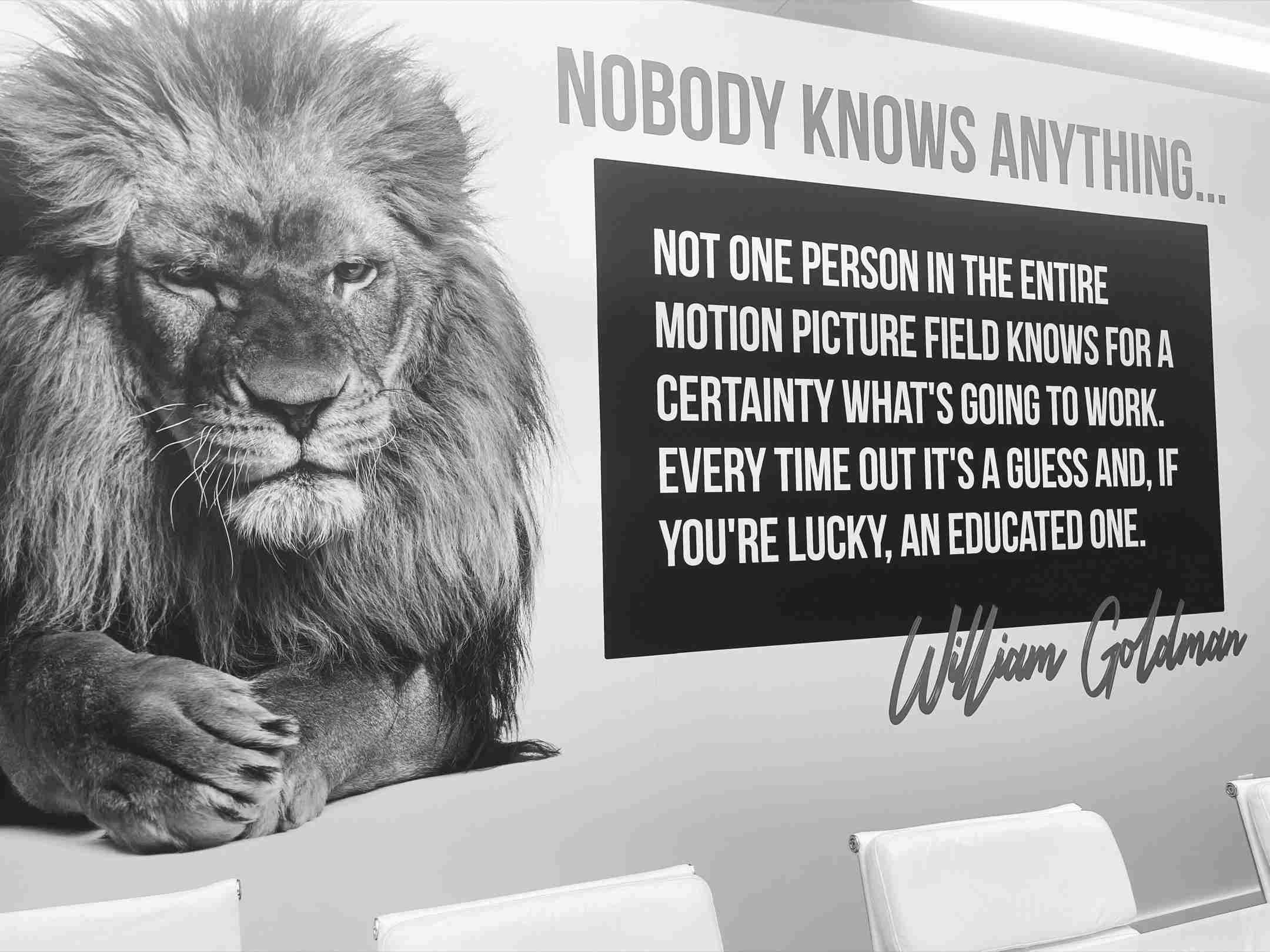 В конференц-зале Valuetainment один художник нарисовал следующую цитату из Уильяма Голдмана: "Никто ничего не знает... Ни один человек во всей сфере кино не знает наверняка, что сработает. Каждый раз это лишь предположение, и если повезет, то обоснованное".