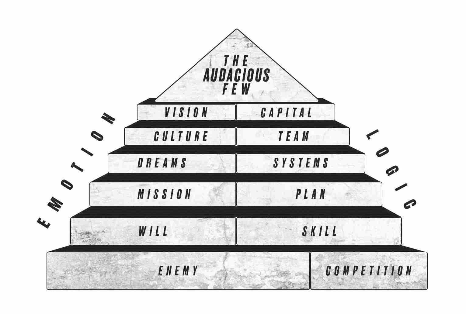 Когда вы смотрите на эту таблицу, я хочу, чтобы вы обратили внимание на три вещи. Во-первых, выбор врага – это основа. Вы должны начать именно с него, чтобы подстегнуть себя к работе и жертвам, которые необходимы для достижения успеха. Далее вы увидите, что есть шесть эмоциональных и шесть логических блоков, которые вы будете интегрировать в план.