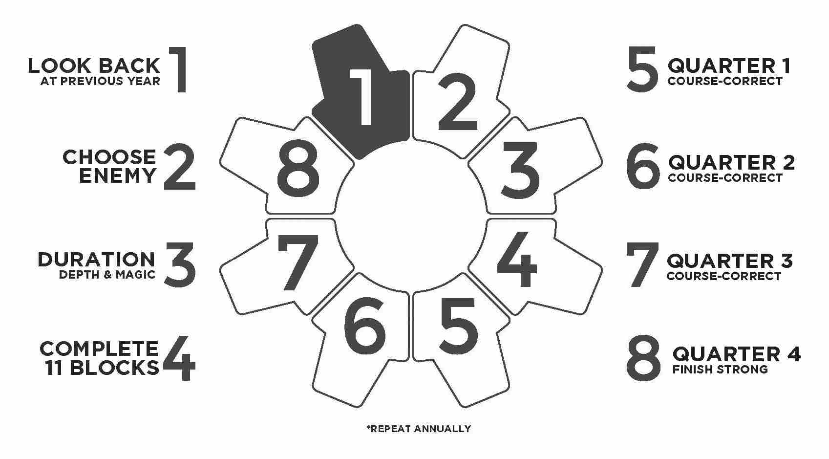 Вы пройдете через процесс ежеквартального обзора три раза перед заключительным кварталом. Когда год закончится, вы оглянетесь на свои годовые цели , увеличите масштаб общей картины, посмотрите, какие цели вы достигли, а какие пропустили и почему. После этого вы проанализируете прошедший год, а затем выберете нового, более сильного врага.