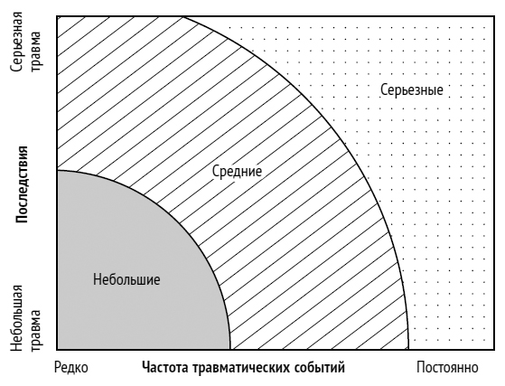 Для понимания серьезности нашего травматического опыта важны два фактора: насколько сильно наш организм подвергается стрессу и на протяжении какого времени. Рисунок 1.1 поможет нам понять, как эти два фактора взаимодействуют между собой. Некоторые события происходят с нами всего однажды или несколько раз, но их влияние столь велико, что оно провоцирует психологическую травму. Вышеописанный эпизод с участием Лоис и ее босса продолжался всего несколько минут, но его последствия оказались весьма серьезными и долговременными. Изнасилование, авария, сексуальные домогательства, жестокое обращение с детьми – именно такие события обычно вызывают сильную эмоциональную травму. Иногда она приводит к тому, что человеку приходится попрощаться с любимой работой, которой он занимался в течение долгих лет.