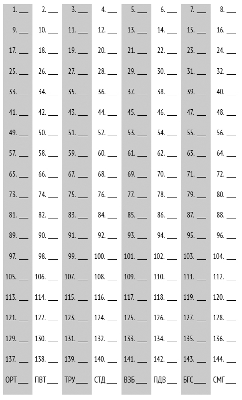 Итак, вы уже прочитали немало страниц этой книги. Давайте подведем некий промежуточный итог и посмотрим, какое влияние психологическая травма оказывает на вашу жизнь. Предлагаем вам ряд утверждений, которые помогут точно оценить ваше текущее поведение. Всего таких утверждений будет 144, и у вас уйдет примерно 40–60 минут на то, чтобы определить, относятся ли они к вам. После этого вы сможете понять, какой тип посттравматического поведения наиболее характерен для вас. Подобный метод уже помог многим людям выяснить, какое влияние на них оказывает пережитая психологическая травма. Я решил поместить эту анкету именно в данную главу, так как точное понимание степени серьезности вашей ситуации уже на столь раннем этапе поможет вам лучше осознать то, о чем пойдет речь дальше. Кроме того, в дальнейшем на основе получившегося индекса мы с вами составим индивидуальный план вашей реабилитации. Я настоятельно рекомендую вам найти время для того, чтобы пройти этот тест.