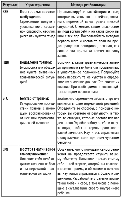 Найдите столбец, в котором вы поставили максимальное количество галочек, – он будет соответствовать определенной аббревиатуре. Каждая такая аббревиатура обозначает конкретный тип поведения, формирующийся в результате травмы. Также в этой таблице вы найдете специальные рекомендации, которые помогут вам быстрее избавиться от последствий травмы. Если в каком-то столбце у вас получилось небольшое количество галочек (0–3), то данная модель поведения точно не относится к вам. Если результат средний (3–6 галочек), то вам стоит обсудить с друзьями или вашим психотерапевтом, какие стратегии реабилитации подойдут вам в данном случае. Если вы поставили в том или ином столбце более шести галочек, то это означает, что у вас уже выработалась соответствующая модель поведения. Обязательно нужно выяснить с вашим психотерапевтом, какие действия вам необходимо предпринять для борьбы с влиянием травмы. Помните, что это всего лишь тест, который призван помочь вам понять степень влияния пережитой травмы на вашу жизнь. Только вы и ваш психотерапевт сможете точно определить, соответствуют ли его результаты вашему реальному состоянию.