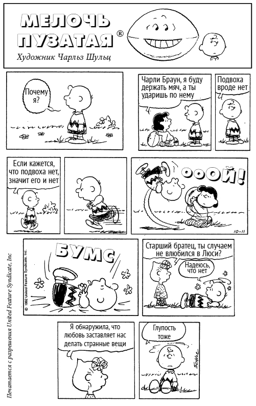Обещания абьюзера кажутся такими заманчивыми, что жертву подводит ее внутреннее чутье. Вот и Чарли Браун раз за разом попадает в эту ловушку. Как мы видим в комиксе на следующей странице, он забывает о том, что сомневался в честности Люси, так как ее доводы кажутся ему искренними. Он так отчаянно хочет поверить в то, что на этот раз она не уберет мяч, что решает вновь ударить по нему. Обещание Люси и отчаянное желание поддаться ему настолько затмевают для Чарли все остальное, что он не замечает очевидного и вновь попадается на крючок. В результате все неизбежно заканчивается для него так же, как всегда.