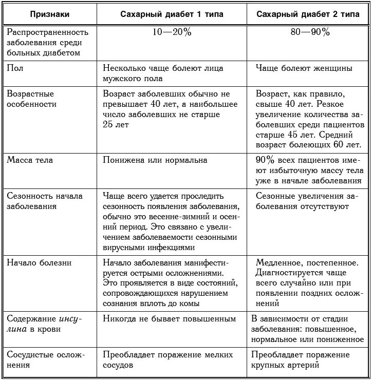 Другие важные отличия между этими типами диабета для наглядности рассмотрены в следующей таблице.