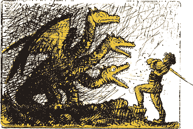 Слышит он вдруг – деревья трещат. Оглянулся, видит – трехголовый дракон среди деревьев продирается, пыхтит, прямо на него прет. Струхнул старший брат, чуть было братьев не окликнул. Да вовремя спохватился. «Не сносить мне головы, – думает, – коли закричу. Но если поддамся дракону, тогда все трое пропадем. Эх, была не была!» А дракон уже совсем рядом. Шипит, огнем плюется! Схватил добрый молодец свой меч и храбро эдак – рраз!! Слетела у дракона голова. Два-а! Слетела с плеч другая. И три-и! Слетела третья.