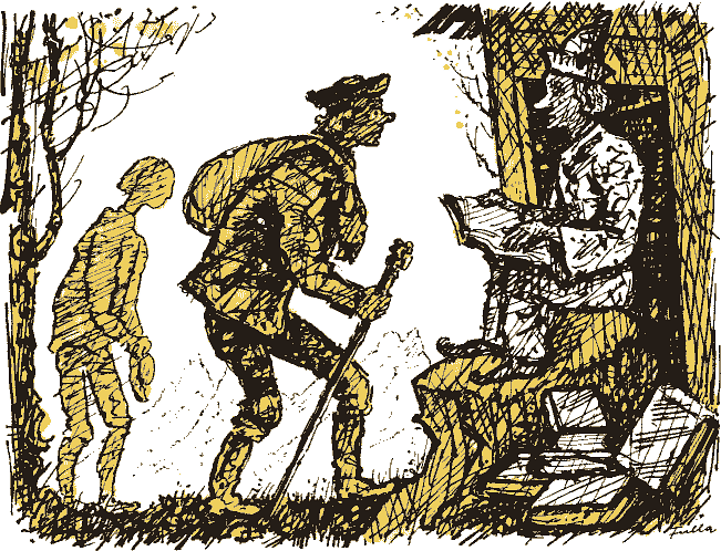 Старик взял окованную железом клюку, в сумку положил последний кусок хлеба, что остался у них в доме и отправился с сыном службу искать. Шли они, шли через горы и долы и наконец увидели человека в чёрном одеянии, который сидел на камне и читал книгу.