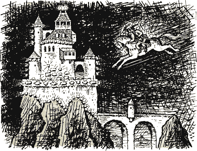 Подъезжает рыцарь к отвесной скале. До чего ж огромная! Поднимает голову, а на самой вершине – могучая крепость стоит. «Что там? – думает рыцарь. – Уж не ведьмы ль поселились? Будь что будет! Все равно туда поеду.»