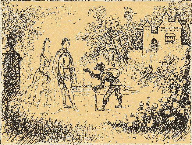 Шагают они по дороге, а навстречу им бродяжка плетется, милостыню просит. Принц ему грош дает и дальше идти собирается, а бродяжка и не думает отставать, набивается на службу. Он ведь тоже свое дело знает, не только хлеб есть мастак!
