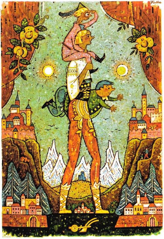 Только Глазастый не спит, ждет, что дальше будет. В полночь видит – золотая птичка из покоев через замочную скважину выпорхнула. Разбудил Глазастый Длинного и они вместе вышли во двор. Глазастый взгромоздился Длинному на плечи, а тот до облаков вытянулся. Поглядел Глазастый вокруг и говорит Длинному, чтобы спешил, ведь принцесса за двести верст улетела. Пустился Длинный за ней, шаг шагнет – версту за собой оставит.