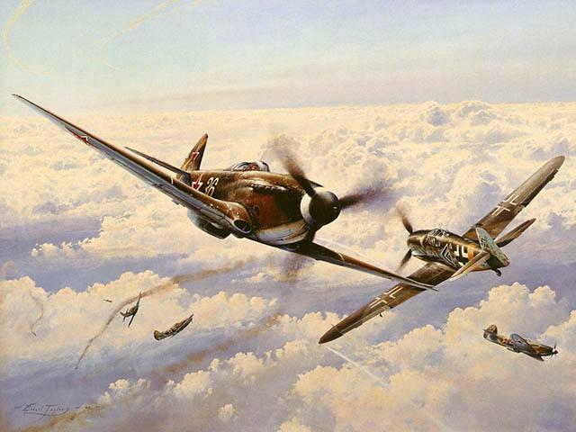 Твою мать! Прозевала! Надо мной проскакивают два мессершмитта… За ними гонятся два лавочкина. Я кручу по сторонам головой… Появляется четвёрка фоккеров и атакует лавочек. Тем на помощь приходят яки… Бой разрастается на глазах. Со всех сторон подтягиваются самолёты и ввязываются в свалку… Парочку уже сбили… По рации слышны одни маты… Я удираю на восток…