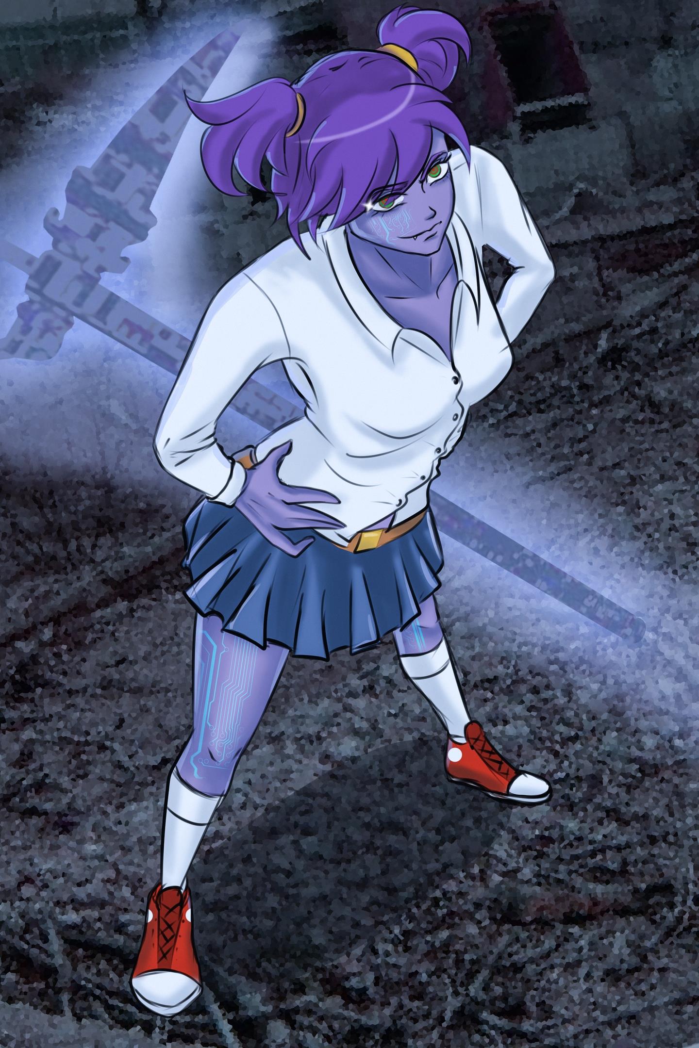 На ребят смотрела невысокого роста девушка, лет 15–16 на вид. Одета она была в короткую юбку и белую блузку с накинутым поверх формальным пиджаком, на ногах сидели кеды, из которых торчали белые гольфы почти до колен. Фиолетовые волосы топорщились по сторонам двумя хвостиками. Вайлет все-таки позаботилась о том, чтобы достать смену одежды для своей новой спутницы.