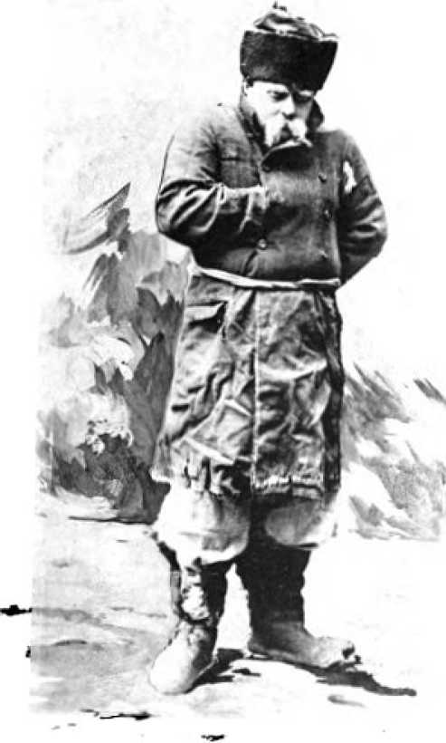 ми тускло смотрели на радостную природу, сменяющуюся то зимой, то осенью, то летом, то весной, серые глаза, добрые, с выражением муки, не загорающиеся ни от чего, кроме горячо любимого отечественного бальзама. Довольно полные губы, цвета долго лежалого мяса, слегка вздрагивали и прикрывали еще сохранившиеся зубы. Довольно правильный, хотя и опухший нос смело выглядывал из за больших серо-желтых усов, ощетинившихся, точно еж, когда до него коснется враг. Руки, красно-пегие от холода, дрожали и эта дрожь быстро переходила в плечи, бежала по хребту и заставляла еще больше дрожать опухлые от ревматизма коленки.