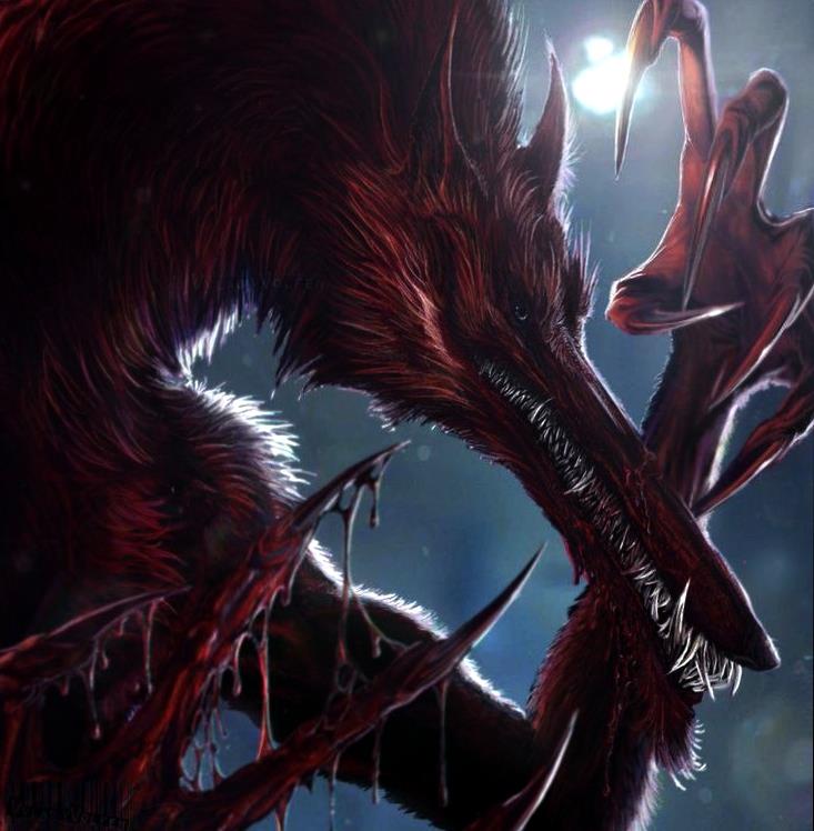 Элиот стоял по уши забрызганный кровью, капли медленно стекали с его бровей. Перед его глазами предстал волкообразный зверь, его рост был около двух метров, прямоходящая тварь с длинными худыми ногами, когтистыми лапами средней плоскости, длинное человекоподобные туловище пышущие мускулами. Длинные мускулистые руки с большими ладонями: которые украшали длинные пальцы и клиновидные когти, по семь сантиметров каждый. Настоящие орудие смерти! Вытянутую пасть усеивали ряды наружурастущих зубов, остры, белы, опасные, глаза твари сверкают серебром, уши навострены, тело в боевой готовности.