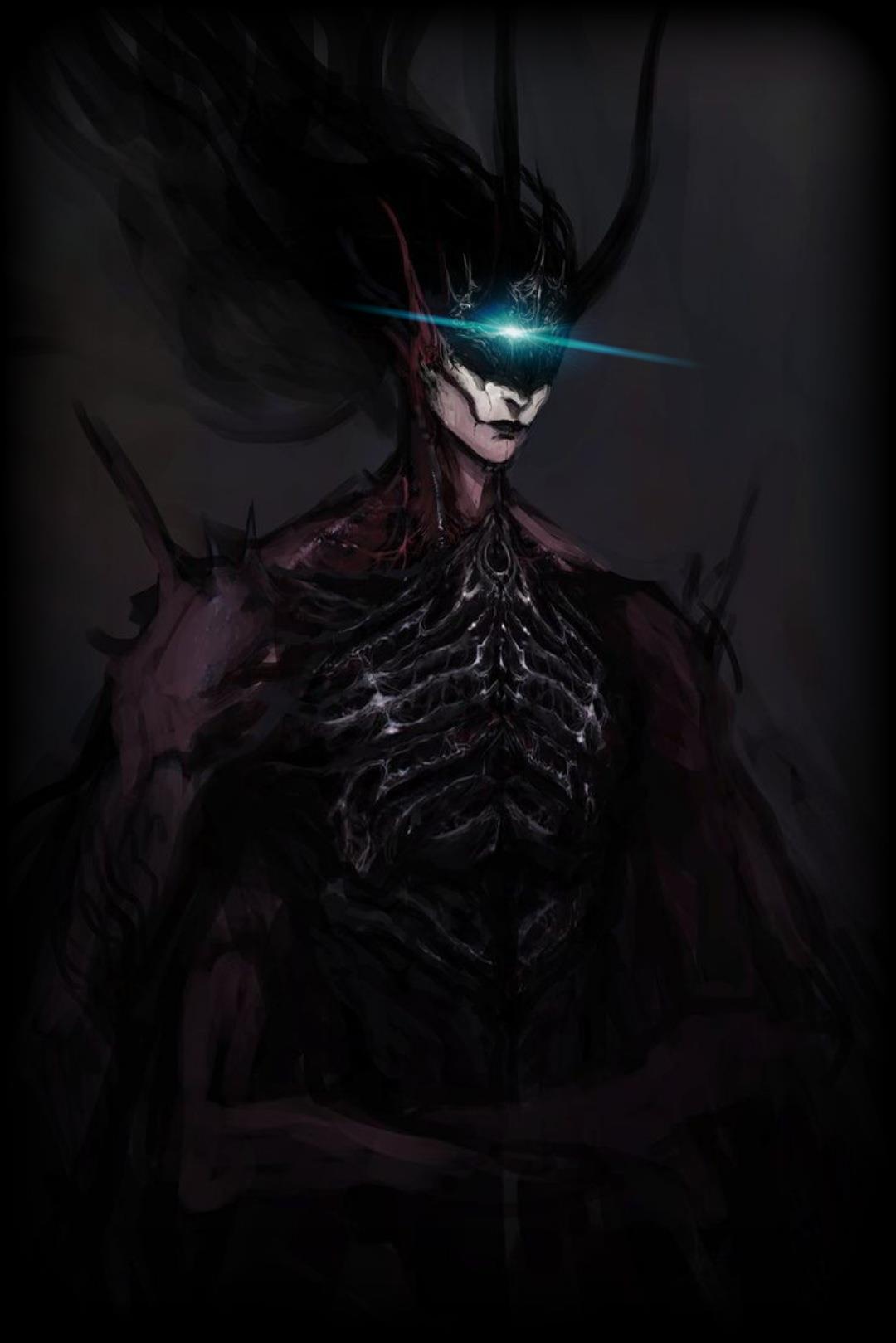 Голову украшают рога из самой тьмы, и волосы им под стать, сплошная сгущённая тень, которая яростно развивается и рисует картину ночи.