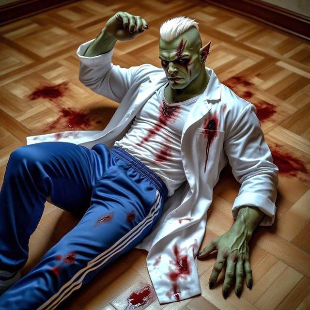 Я проследил за указующим кивком бойца, и к горлу мигом подкатил комок тошноты. В шаге от меня замерло в луже крови обезглавленное тело, ковёр на стене оказался забрызган мозгами и перепачкан ошмётками скальпа. Распахнутый белый халат не скрывал тёмно-зелёную кожу безволосой груди.