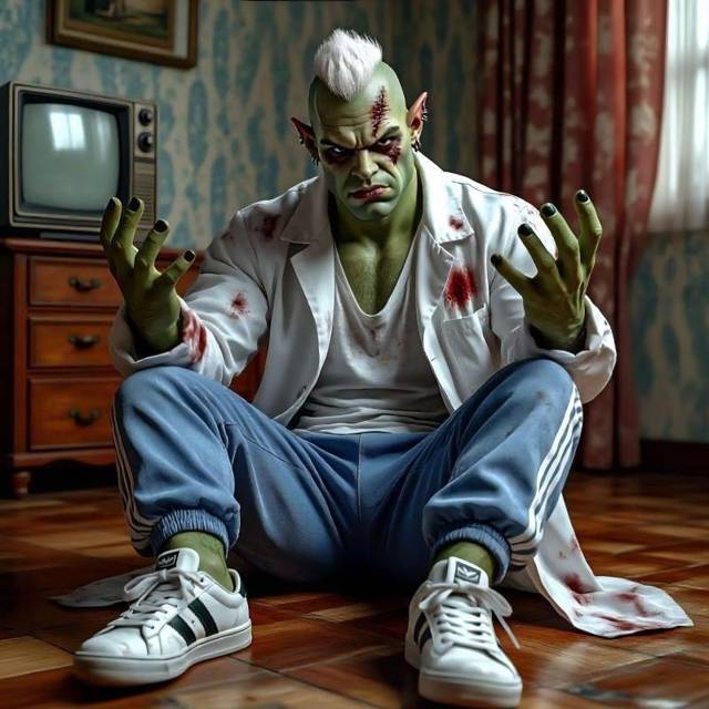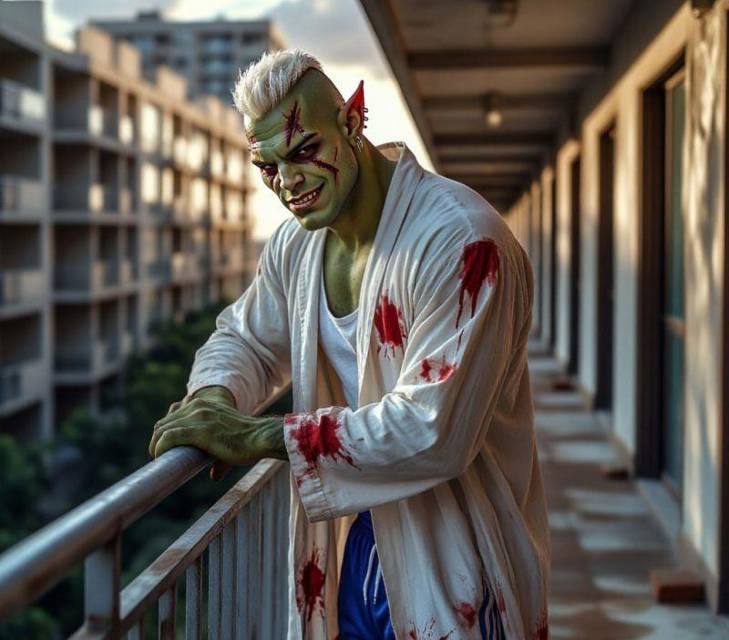 Ну да – всё же не морды и не хари, а лица. В крайнем случае – рожи. Островерхие уши, тяжёлая челюсть с ямочкой, массивные надбровные дуги, широкий рот с парочкой торчащих наружу клыков, чуть приплюснутый нос, малость толстоватые губы. На голове – обесцвеченный короткий ирокез. Ну или не обесцвеченный, а натурального оттенка, потому как красноватые глаза точно принадлежали альбиносу. На правой скуле багровела ссадина и чернел кровоподтёк, бровь оказалась рассечена.