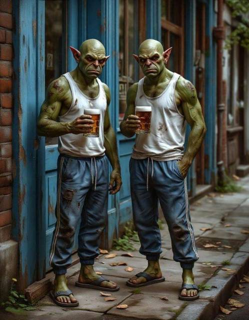 На первый взгляд, больше всего в округе обитало кого-то вроде гоблинов. Тут и там сновали эти зелёные, сероватые и песочного оттенка лысые коротышки, одетые преимущественно в трико, растянутые майки-алкоголички и шлёпанцы. Некоторые водрузили на головы свёрнутые из газетных листов панамы, один важно прошествовал с забитой пустыми бутылками авоськой, другой прокатил нагруженную каким-то хламом тележку. Но в основе своей пропитого вида бездельники сбивались в небольшие компашки, курили и настороженно зыркали по сторонам.