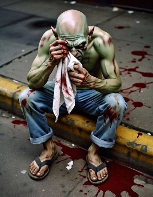 А вот кого мы застали у пивной, так это десяток подвыпивших гоблинов, один из которых сидел на бордюре и зажимал окровавленной майкой свою зелёную физиономию. С учётом отколотого горлышка от пивной бутылки, валявшегося тут же на забрызганном красным асфальте, случившееся двоякого толкования не допускало: было ясно и понятно, что кто-то недомерка этой самой розочкой по харе и полосонул. И наверняка был этот кто-то из числа собутыльников, но поисками виновного пусть милиция занимается, мы сюда не за тем приехали.