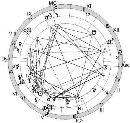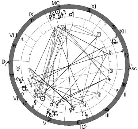 Для того чтобы не быть голословными, приведем пример гороскопа государства, просуществовавшего недолго, но наделавшего много шума в ХХ веке. Речь идет о III рейхе, в гороскопе которого соединение Хирона с Черной Луной имело место вблизи Асцендента, Венера находилась в зените, а Плутон – в надире. Три угловые точки астрологической карты создания государства были задействованы планетами, что предполагает жесткую взаимосвязь между судьбой государства и судьбами людей, определявшими его внешнюю и внутреннюю политику. Поражение нацистской Германии во II мировой войне привело к падению рейха, и, как следствие – к Нюрнбергскому процессу, на котором судили военных преступников. Более 30 важнейших лиц гитлеровской Германии понесли персональную ответственность за все произошедшее. В гороскопе III рейха Хирон – планетоид правосудия вместе с Черной Луной оказался в Близнецах вблизи точки восхода. Вот и получилось, что политическая верхушка государства оказалась воплощением мирового зла и в этом качестве предстала на скамье подсудимых в Нюрнберге. Кто не успел покончить с собой – был казнен. Если бы Германия, не дай бог, оказалась сильнее Советского Союза, то человечество, наверняка стало бы свидетелем суда над военными преступниками сталинского режима. Но победил сильнейший и случилось то, что случилось.