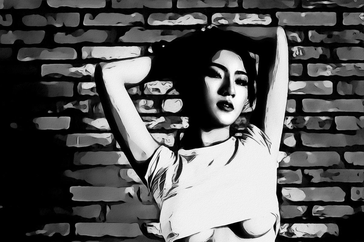 Азиатка. Скорее кореянка, чем китаянка, вряд ли японка. Симпатичная, смеющиеся раскосые глаза. Невысокая. Худая с узковатыми бёдрами. Чёрные волосы, которые она как раз вытирает полотенцем, закинув руки назад так, что соски торчат очень задорно.