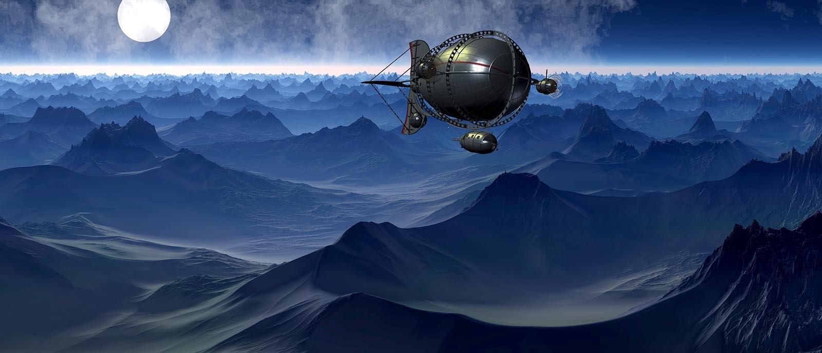 Волантер плывёт над пустыней в закатных лучах. Тень имеет непривычные очертания из-за висящей под гондолой цистерны, но на ходовых качествах это практически не сказалось.