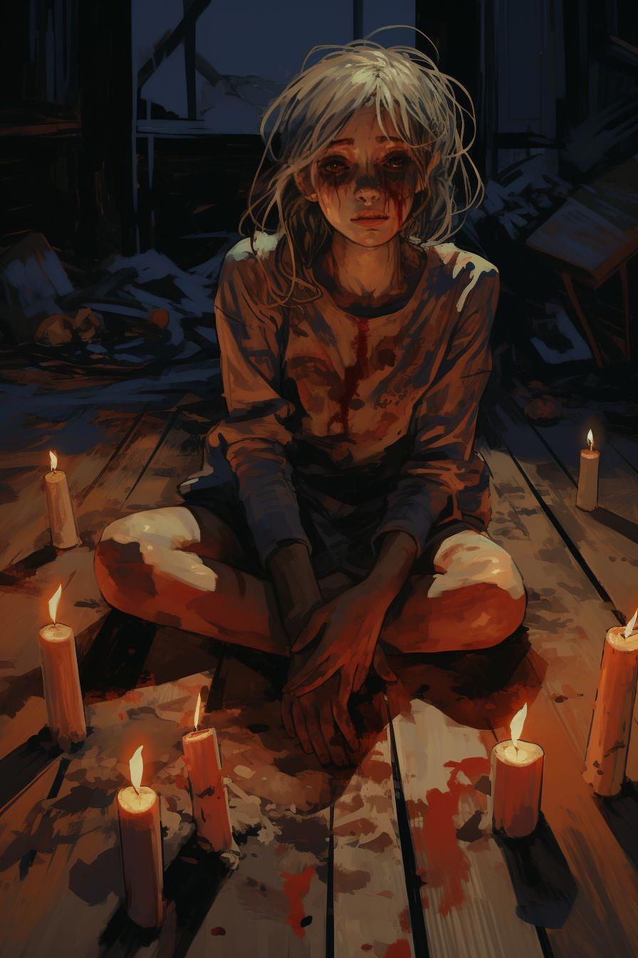 На деревянном полу, поджав под себя голые ноги, сидит в одной длинной грязной рубашке девчушка с растрёпанными светлыми волосами. Здесь электричества нет, горят свечи, у стен валяется какой-то мусор, тряпки, порванная юбка. Девочка сильно избита, лицо в потёках крови, изодранные травмированные руки как будто кто-то отрывал от себя, ломая её пальцы; окровавленная одежда, потеки крови на бёдрах, пятна на полу. Она не выглядит даже на свои вот-вот восемнадцать. Сидит, бессмысленно глядя сквозь меня, и слегка покачивается, мыча под нос что-то заунывное без слов.