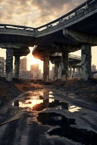 Потыкавшись по развязкам, нашли-таки съезд в нужную сторону. Он вывел нас на проспект внизу, метрах в ста от места падения. Подъехать вплотную не удалось, всё завалено кусками бетона, обрушившимися когда-то с эстакады. Пришлось вылезать и ковылять пешком, что не слишком удобно на протезе. По ровному он туда-сюда, а карабкаться по обломкам хреново. Несколько раз споткнулся, оцарапал руки арматурой, ссадил колено.