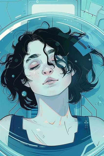 Семнадцатилетнее сновидение смотрит на двадцатилетнюю себя, опираясь локтем на капсулу.
