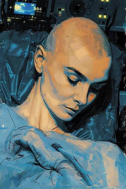 Лысая женщина со шрамированной башкой, несчастная и бледная, лежит на кровати. На её лице сплошные очки, как лыжные, только потоньше.