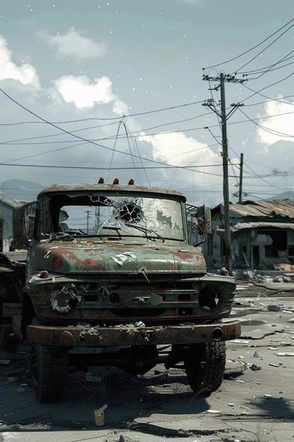 Три грузовика незнакомых моделей, рядом с ними «Нива». Все машины расстреляны, судя по пробоинам – из пулемётов. За металл уже зацепилась ржавчина, но, судя по всему, бой был не очень давно, с год назад.