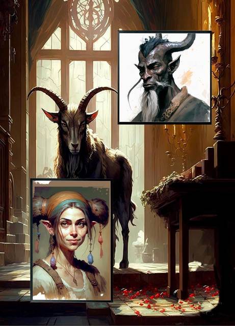 Стоящее перед дверью существо прямоходящее, с полукозлиным-получеловеческим лицом, тёмной кожей выше пояса и чёрной шерстью ниже. Ноги остались козлиными, сгибающимися назад, лохматыми и копытистыми.