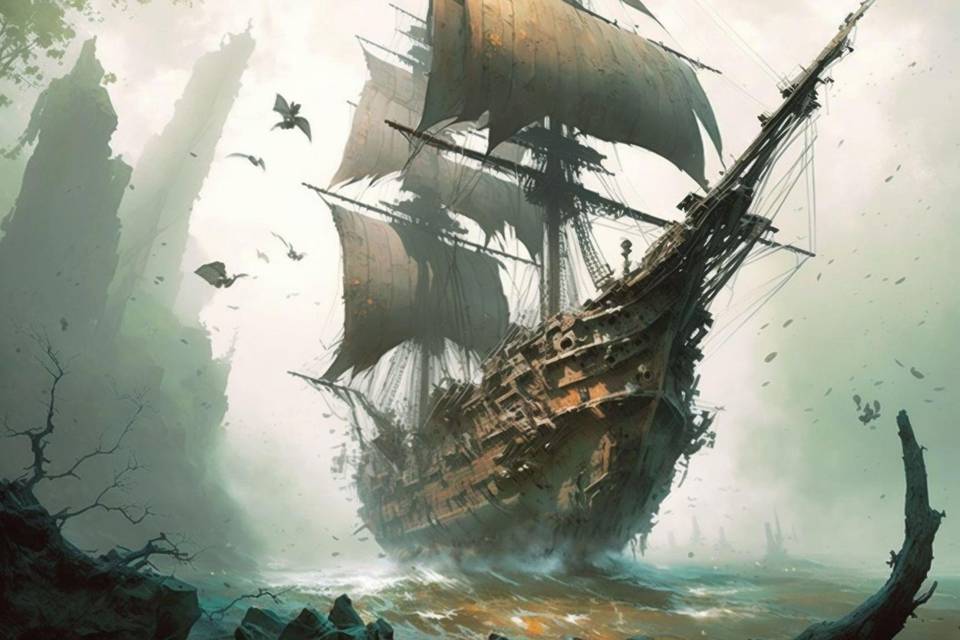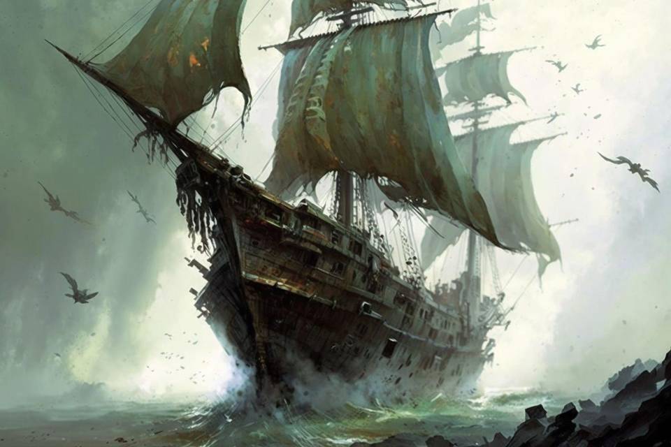 Из тумана постепенно проступают очертания огромного, но крайне ветхого парусника. Он покрыт плесенью и водорослями, с бушприта свисает бахрома не то растений, не то паутины, в бортах зияют неряшливые проломы, на мачтах висят драные, как старые тряпки, паруса, которые, вопреки своей очевидной негодности, туго натянуты несуществующим ветром. Корабль приближается совершенно бесшумно – не скрипят снасти, не плещут волны в борта, не хлопают полотнища парусов, ни звука не издаёт стоящая вдоль бортов абордажная команда.