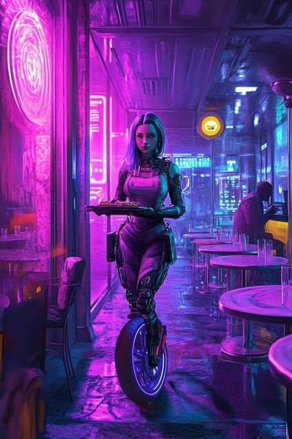 Официантка здесь с оригинальным имплосетом – механический тазовый пояс и подрессоренное моноколесо. Катается на нём туда-сюда с подносом в руках. Верхняя часть натура или хорошая имитация – прикрытый лёгким топиком бюст. На мой профессиональный взгляд верхние конечности, скорее всего, частично или полностью импловые, но сделано под натуру, как на мапах. Иначе она бы с таким подносом долго не прокаталась. Личико симпатичное, но рендовая прошивка дешёвенькая, поэтому мимика бедная. Подъехала, стандартно улыбнулась. На бейдже написано: «Собственность бара 'Третье колесо»«. За сиськи не хватать!!!»