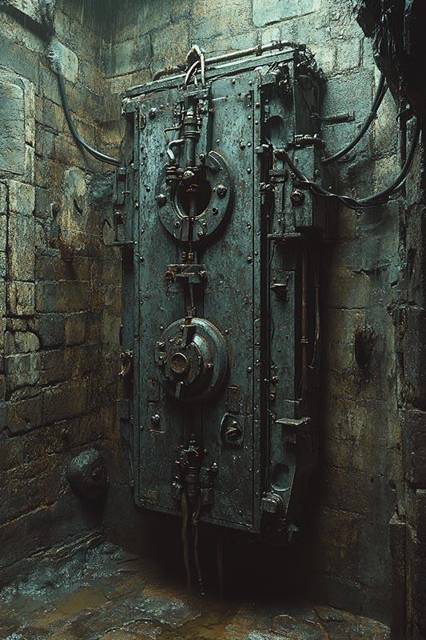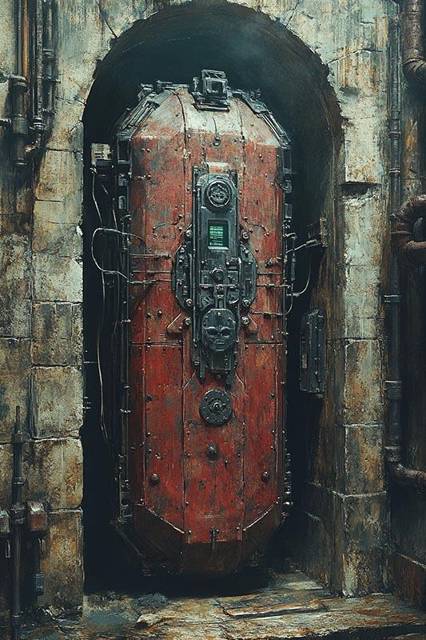 В следующей комнате в каменной стенной нише установлено устройство, похожее на массивный вертикальный гроб. Передняя часть его из красноватого дерева, обрамлена металлической окантовкой, имеет вид разъёмной. По центру загадочный приборный модуль, в который тут же уверенно ткнула пальчиком Крисса. Крышка раскрылась, распавшись на две части, верхнюю и нижнюю. Внутри пусто, пространство как раз чтобы человеку поместиться. Стенки гладкие, а я уж ожидал каких-то шипов в стиле «железной девы». Всё равно ощущение от этой штуки чертовски зловещее. Не выглядит она позитивно.
