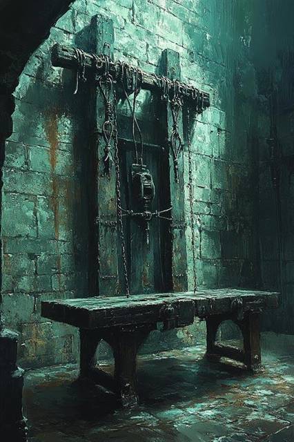 За следующей дверью что-то очень похожее на пыточную – закреплённая на стене деревянная конструкция, перед ней низкий длинный стол из толстых, обитых железом досок.