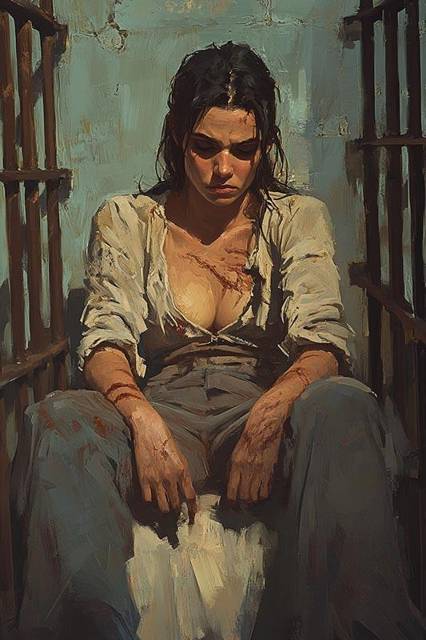 Девушка сидит в узкой камере с решётками. Лицо потерянное и отчаявшееся, одежда разорвана, спутанные грязные волосы, глубокие царапины на груди и руках – и пронзительно синие глаза.