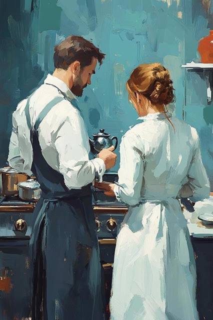 В общей кухне-столовой Хелана и Алексим заканчивают готовку. Они принарядились, мужчина прикрывает синим фартуком свежую сорочку, женщина в белом закрытом платье. Лиарна выглядит на их фоне простовато, а Деян и Ингвар одеты как всегда.
