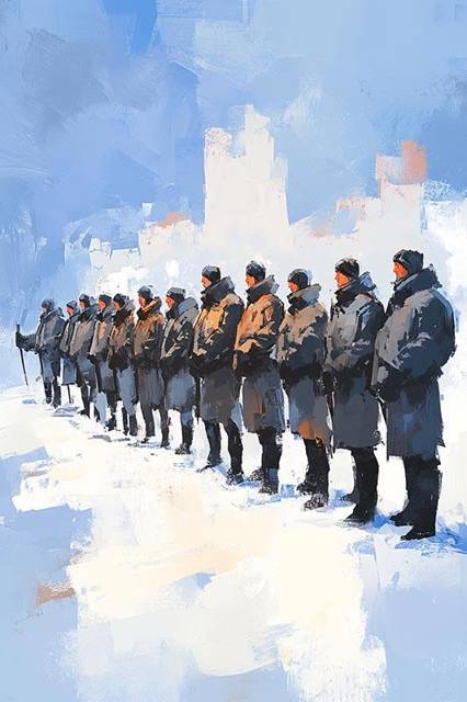 Стоящие в строю люди уже подмёрзли и ёжатся на холодном ветру, но слушают внимательно.
