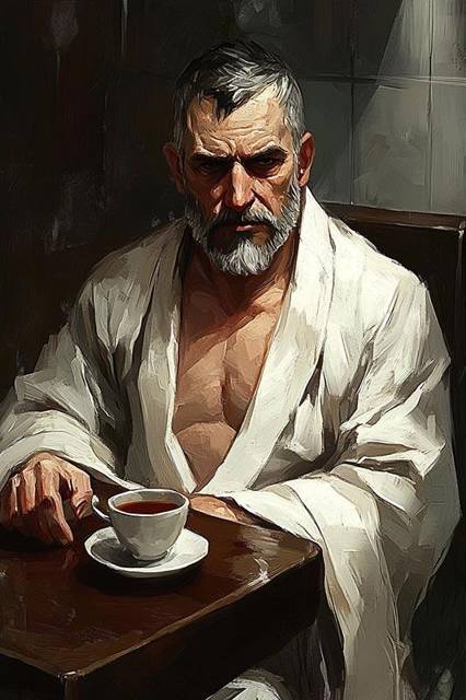 Он уже посидел в парной, помылся, снова попарился и теперь ждёт, пока просохнут волосы.