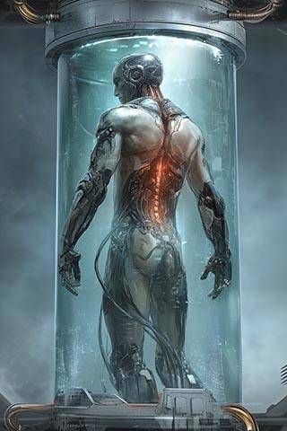 – «Протей». Это как бы человек, но полностью из имплов. Ни шкуры, ни мяса и пустая черепуха на месте башки. По мере формирования он продвигается от того бака к этому, в каждом синтезируется что-то новое. Несущее шасси, миогруппы, система питания и так далее. Вот здесь заканчивается процесс, открывается крышка, он лежит такой. Сам по себе ни на что не годен, так что на выходе его разбирают на имплы, упаковывают их, что-то там ещё делают, потом на склад.