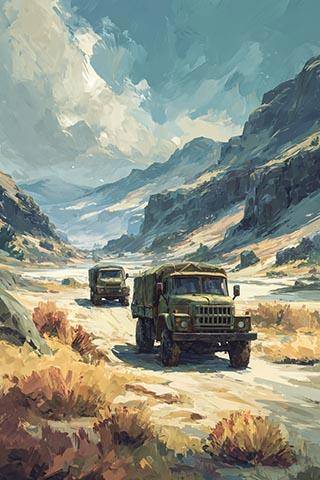 Из ворот бетонного сооружения выезжают один за другим четыре зелёных угловатых грузовика. Я такие вижу впервые, совершенно не похожи ни на городские, ни на клановые машины. Наверное, на бензе работают, для электрических слишком здоровые, да и звук не такой. Кузова затянуты тентами, что в них лежит, не разглядеть.