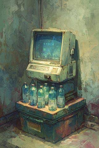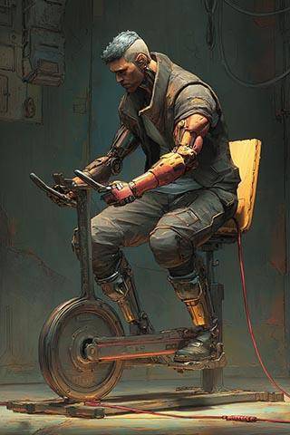 «Тренажёры» крутят и качают рендовые силовики, их тут десятки, так что только хруст стоит. Хруст, скрежет и тяжёлый гул массивных маховиков, которые они раскручивают через несложные механические передачи. Маховики приводят во вращение электромоторы от мобилей, которые в таком режиме работают генераторами. Между рядами агрегатов бегают замотанного вида молодые парни с поилками, полными питательного раствора для кибов. Один из них на моих глазах воткнул массивную пластиковую бутыль в рот крутящему педали силовику, тот присосался, с хлюпаньем втягивая жидкость.