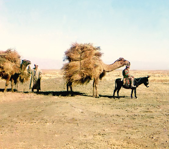Караван верблюдов, везущий колючку для корма. Голодная степь. 1911. Фото С. М. Прокудина-Горского. Источник: Библиотека Конгресса США. CN: 2018680305