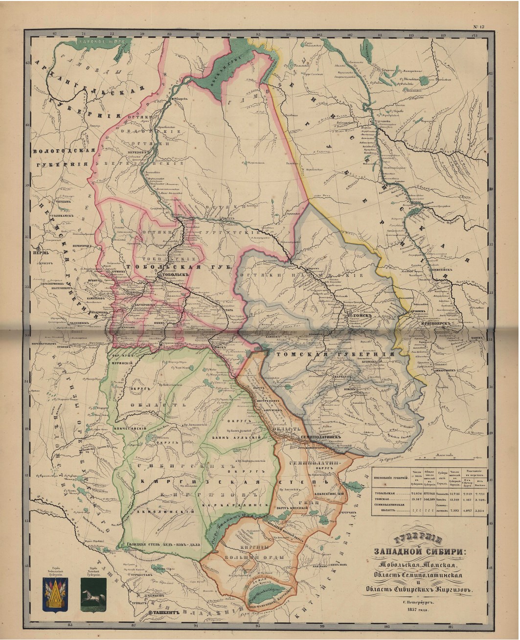 Губернии Западной Сибири: Тобольская, Томская, Область Семипалатинская и Область Сибирских киргизов. Карта № 17. Источник: Подробный атлас Российской империи. Составитель Н. И. Зуев. СПб., 1860