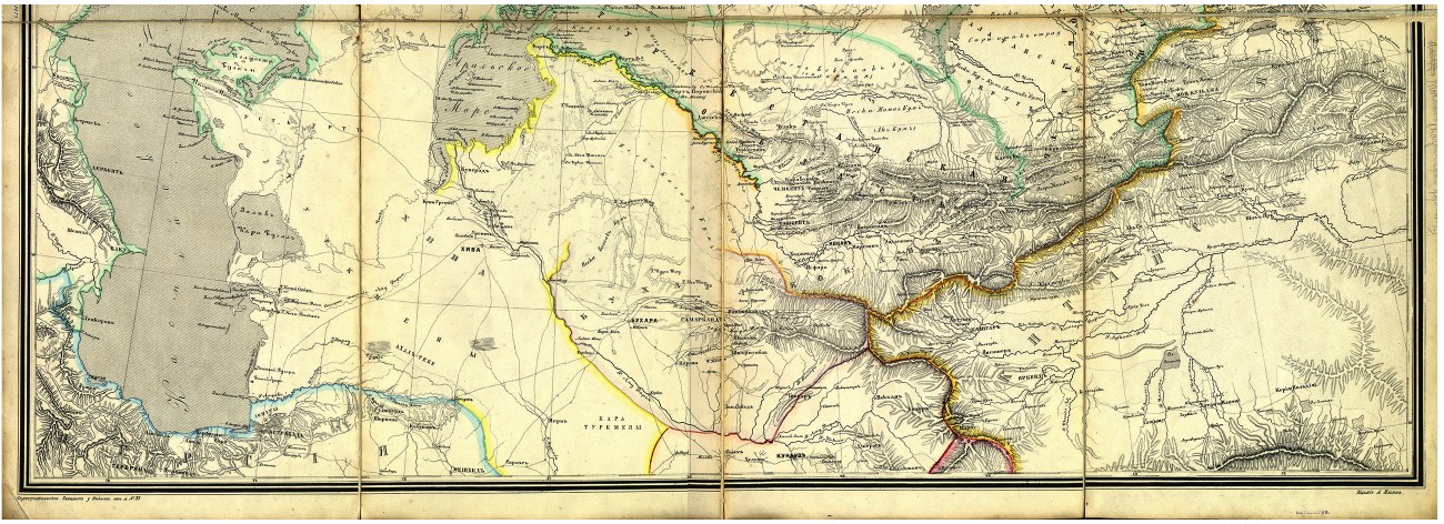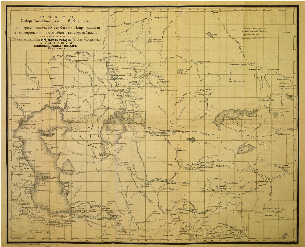 Карта Северо-Западной части Средней Азии с показанием мест, положение которых определено астрономически, и пространств, исследованных европейцами. Составлена Я. В. Ханыковым. Источник: Записки Императорского Русского географического общества. 1855. Кн. 10. С. 337
