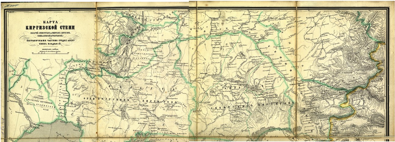 Карта Киргизской степи (областей: Оренбургских и Сибирских киргизов, Семипалатинской и Туркестанской) с пограничными частями среднеазиатских владений. Б/д. Источник: БАН. Ф. 1. Оп. 2–5. Д. 47. Карта № 1. Фрагменты 1–4