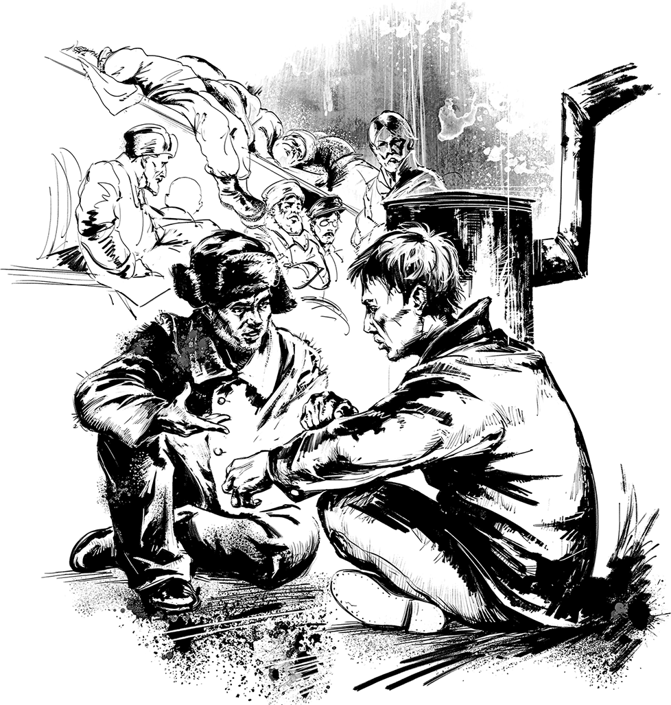 Устроились мы удобно – и у печки, и на виду, но при этом как бы за стаей молодых урок, которые, сидя на корточках, почесывались, искали вшей, жевали что-то сомнительное и передавали друг другу кружку с почти кипящей водой, отхлебывая по глоточку. При этом они не переставали громко смеяться и травить какие-то мерзкие истории на смеси фени и мата. Смысл я не мог понять при всем желании, но дело полезное: так наш разговор гарантированно никто не разберет.